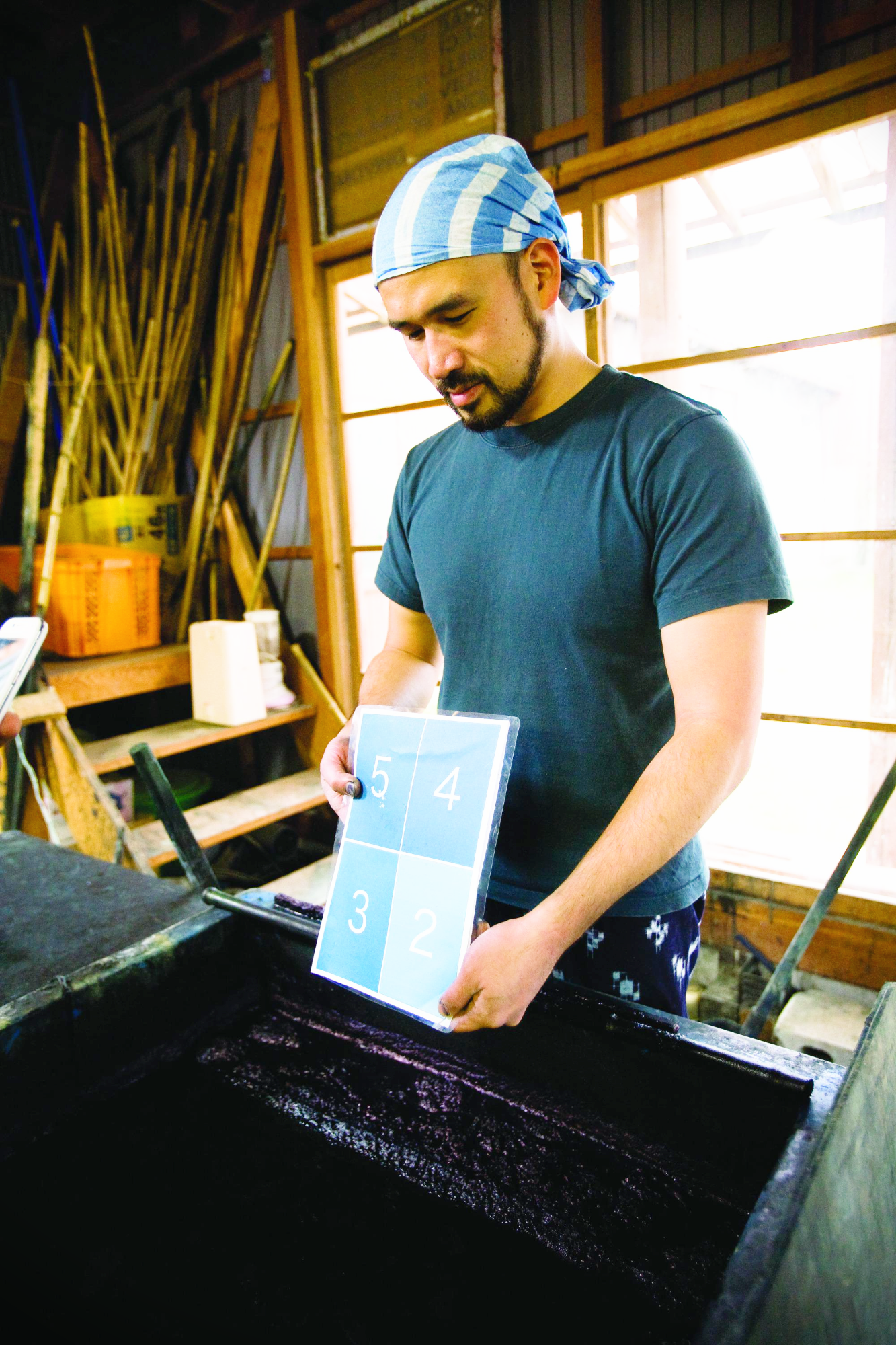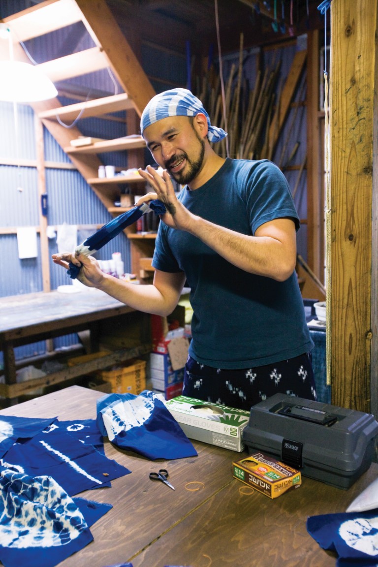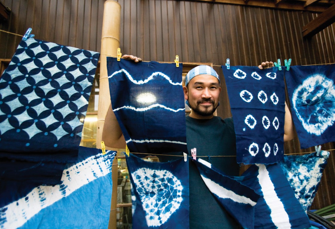 "쪽염색은 카스리라고 물감이 살짝 스친 것 같은 부분을 규칙적으로 배치한 무늬, 또는 그런 무늬가 있는 직물 기술이지요. 1827년 야스기시 히로세초에 퍼지면서 히로세초를 중심으로 염색 직물문화가 번성하게 됐습니다. 이곳 아마노코야는 1870년에 창업하여 5대에 걸쳐 138년의 오래된 역사와 전통을 자랑하는 곳으로 현재의 후계자는 바로 접니다.(웃음)"