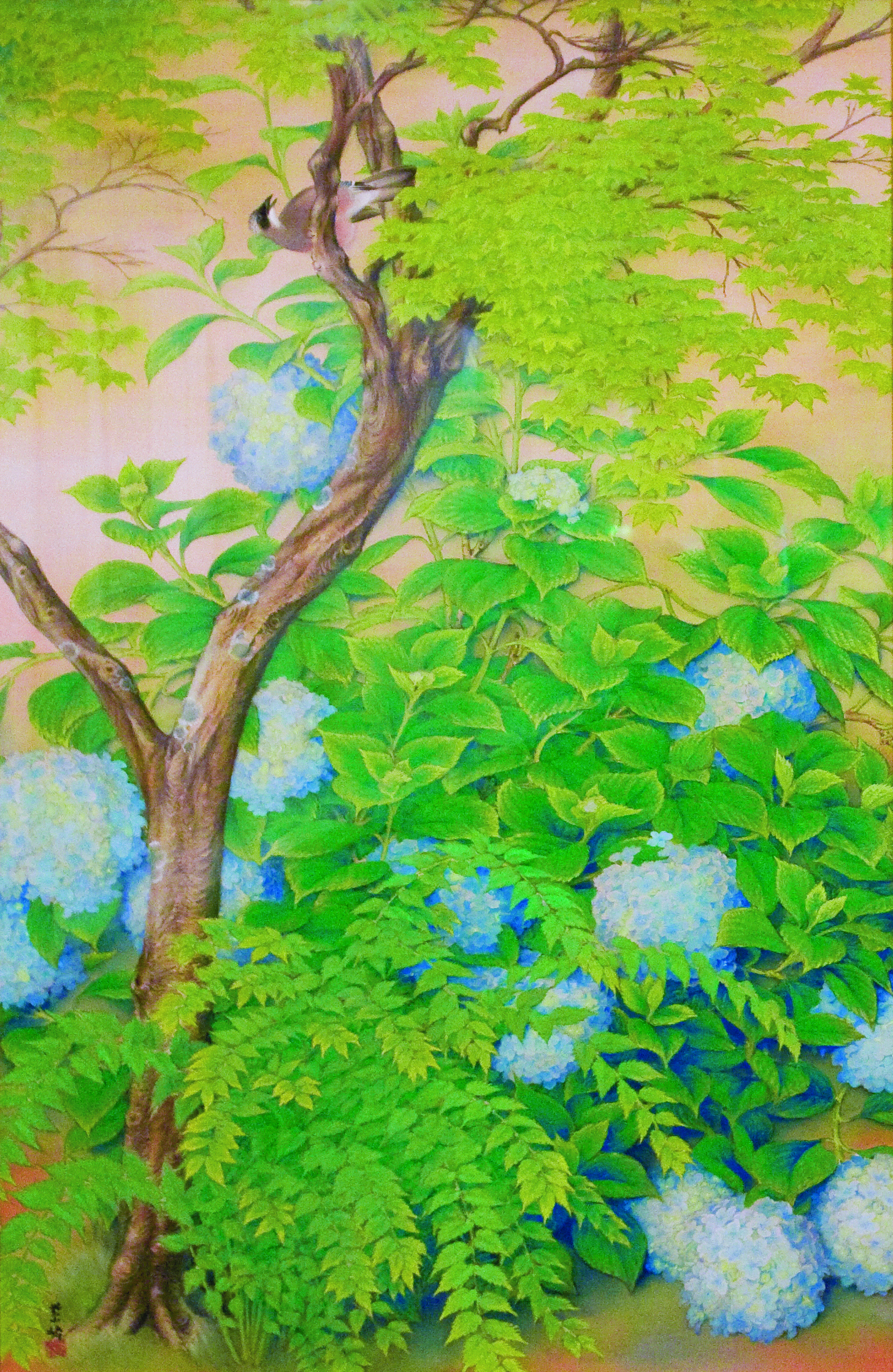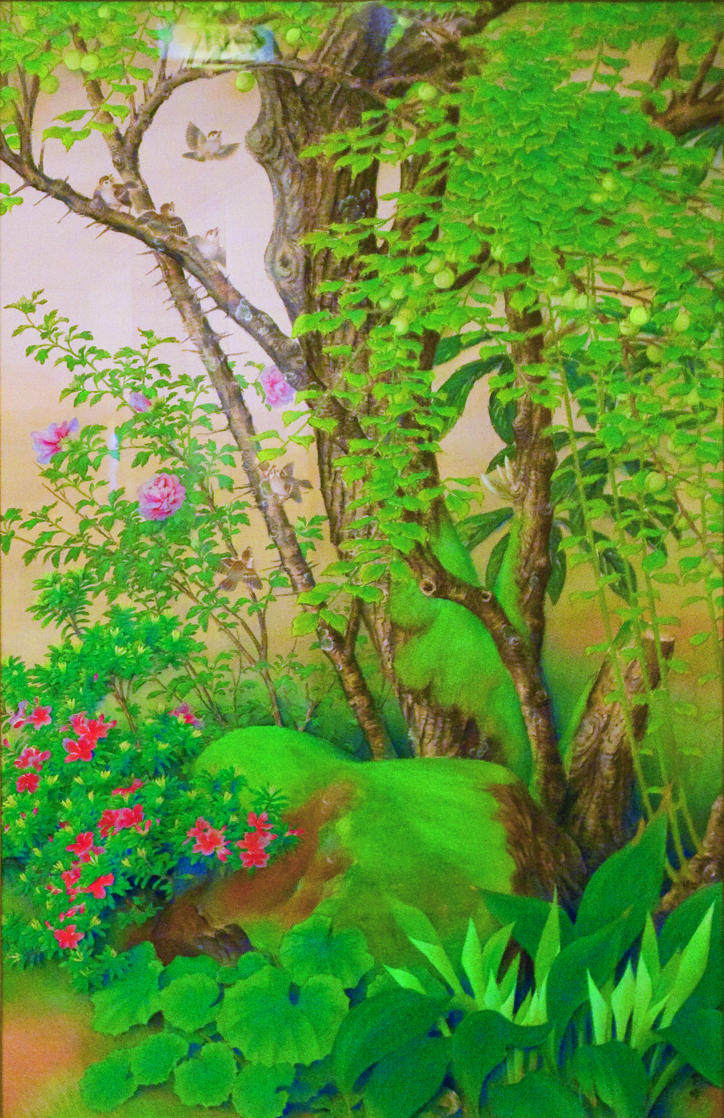 사카키바라 시호(1887~1971)는 쿄토시 나카교구 출신으로 염직가에서 태어났다. 꽃과 새에 대한 애정으로 생에 화조화를 거듭해서 그렸다고 한다. 사카키바라 시호의 전시관에 들어갔을 때의 첫 느낌은 아다치 정원의 정취와 꼭 빼어 닮았다는 것이다. 누구에게나 자신에게 다가온 풍경을 잠시 일시 정지시키고플 때가 있을 것이다. 사카키바라 시호의 그림 속에는 그러한 소망의 낭만이 녹아있다. 자신에게 걸어오는 자연의 속삭임을 한 음, 한 음 화면 위에 풀어 놓듯, 느리고 야무진 손끝으로 보여주는 그의 세계는 사실적이지만 경직되어 보이지 않는다. 어린 시절부터 하얀 천에 고운 빛들이 물들어 가는 모습을 보고 자란 그가 화면 위에 푸른 풀잎의 한 때, 참새가 지저귀는 한 울림을 그려나가는 화가가 된 것이 자연스럽게 느껴진다. 전시장 정면에 나란히 걸려있는, 닮은 듯한 두 그림이 인상적이다. 두 점이 한 쌍인 작품으로 제목은 <푸른 매화>. 보통 매화의 절정을 떠올리면 추위가 마지막 기세를 뽐낼 때 즈음 짙은 가지에 소복이 피어나는 하얀 꽃들이 떠오르기 마련이다. 하지만 사카키바라 시호는 매화나무의 푸른 생기를 보았다. 수국과 장미 사이를 리드미컬하게 하지만 든든하게 뻗어가는 매화나무에서 여린 매화꽃잎의 찬란함이 아닌, 이제 시작해 볼까 기지개를 켜는 매화의 싱싱한 생명력을 느낄 수 있다.