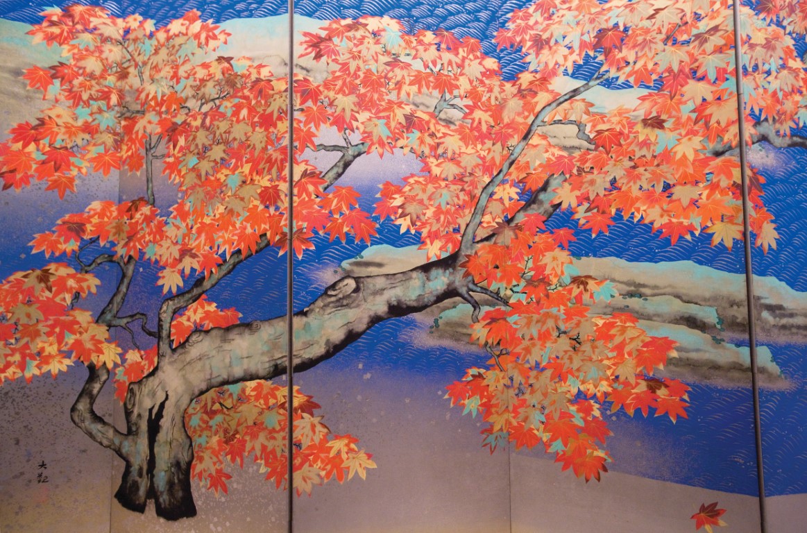 입구에 들어설 때부터 요코야마 다이칸의 대표작이라 할 수 있는 <단풍>이란 기다란 병풍화가 강렬한 색감으로 시선을 사로잡는다. 미풍이 부는 물가에 타오를 듯 붉은 단풍이 늘어져 있는 모습을 그린 그림이다. 과감하게 뻗어나가는 나뭇가지와 선명한 단풍에서 89세 나이로 서거할 때까지 작품 활동을 쉬지 않았다던 작가의 우뚝한 기개가 드러난다. 헌데 붉고 푸름의 조화가 범상치 않다. 따스한 가을 햇살의 풍요로운 느낌이 아니라, 겨울의 길목에 도달한 가을이 자신의 몸에 남은 열기로 나무들을 붉게 물들이고 도도하게 돌아서는 서늘함이다. 그 상쾌함에 시선이 오래 머문다.